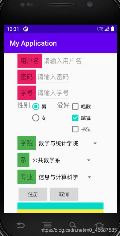 <?xml version="1.0" encoding="utf-8"?> <LinearLayout xmlns:android="http://schemas.android.com/apk/res/android" xmlns:app="http://schemas.android.com/apk/res-auto" xmlns:tools="http://schemas.android.com/tools" android:layout_width="match_parent" android:layout_height="match_parent" android:orientation="vertical" android:gravity="center" tools:context=".MainActivity"> <ScrollView android:layout_width="wrap_content" android:layout_height="wrap_content" android:scrollbars="none"> <LinearLayout android:layout_width="wrap_content" android:layout_height="wrap_content" android:orientation="vertical"> <LinearLayout android:layout_width="wrap_content" android:layout_height="wrap_content"> <TextView android:layout_width="wrap_content" android:layout_height="wrap_content" android:text="用户名" android:textSize="18dp" android:background="#E91E63" android:padding="8dp" /> <EditText android:layout_width="wrap_content" android:layout_height="wrap_content" android:id="@+id/edt1" android:hint="请输入用户名" /> </LinearLayout> <LinearLayout android:layout_width="wrap_content" android:layout_height="wrap_content"> <TextView android:layout_width="wrap_content" android:layout_height="wrap_content" android:text="密码" android:textSize="18dp" android:background="#E91E63" android:padding="8dp" /> <EditText android:layout_width="wrap_content" android:layout_height="wrap_content" android:id="@+id/edt2" android:hint="请输入密码" android:inputType="numberPassword" /> </LinearLayout> <LinearLayout android:layout_width="wrap_content" android:layout_height="wrap_content"> <TextView android:layout_width="wrap_content" android:layout_height="wrap_content" android:text="学号" android:textSize="18dp" android:background="#E91E63" android:padding="8dp" /> <EditText android:layout_width="wrap_content" android:layout_height="wrap_content" android:id="@+id/edt3" android:hint="请输入学号" android:inputType="number" /> </LinearLayout> <LinearLayout android:layout_width="wrap_content" android:layout_height="wrap_content"> <TextView android:layout_width="wrap_content" android:layout_height="wrap_content" android:text="性别" android:textSize="18dp" /> <RadioGroup android:layout_width="wrap_content" android:layout_height="wrap_content" android:id="@+id/rg1" android:orientation="vertical"> <RadioButton android:layout_width="wrap_content" android:layout_height="wrap_content" android:id="@+id/rb1" android:text="男" android:checked="true" /> <RadioButton android:layout_width="wrap_content" android:layout_height="wrap_content" android:id="@+id/rb2" android:text="女" /> </RadioGroup> <TextView android:layout_width="wrap_content" android:layout_height="wrap_content" android:text="爱好" android:textSize="18dp" android:layout_marginLeft="30dp" /> <LinearLayout android:layout_width="wrap_content" android:layout_height="wrap_content" android:orientation="vertical" > <CheckBox android:layout_width="wrap_content" android:layout_height="wrap_content" android:text="唱歌" android:id="@+id/cb1" /> <CheckBox android:layout_width="wrap_content" android:layout_height="wrap_content" android:text="跳舞" android:checked="true" android:id="@+id/cb2" /> <CheckBox android:layout_width="wrap_content" android:layout_height="wrap_content" android:text="书法" android:id="@+id/cb3" /> </LinearLayout> </LinearLayout> <LinearLayout android:layout_width="wrap_content" android:layout_height="wrap_content"> <TextView android:layout_width="wrap_content" android:layout_height="wrap_content" android:text="学院" android:textSize="18dp" android:background="#4CAF50" android:padding="8dp" /> <Spinner android:id="@+id/sp1" android:layout_width="wrap_content" android:layout_height="wrap_content" /> </LinearLayout> <LinearLayout android:layout_width="wrap_content" android:layout_height="wrap_content"> <TextView android:layout_width="wrap_content" android:layout_height="wrap_content" android:text="系" android:textSize="18dp" android:background="#4CAF50" android:padding="8dp" /> <Spinner android:id="@+id/sp2" android:layout_width="wrap_content" android:layout_height="wrap_content" /> </LinearLayout> <LinearLayout android:layout_width="wrap_content" android:layout_height="wrap_content"> <TextView android:layout_width="wrap_content" android:layout_height="wrap_content" android:text="专业" android:textSize="18dp" android:background="#4CAF50" android:padding="8dp" /> <Spinner android:id="@+id/sp3" android:layout_width="wrap_content" android:layout_height="wrap_content" /> </LinearLayout> <LinearLayout android:layout_width="wrap_content" android:layout_height="wrap_content"> <Button android:id="@+id/btn1" android:layout_width="wrap_content" android:layout_height="wrap_content" android:text="注册" /> <Button android:id="@+id/btn2" android:layout_width="wrap_content" android:layout_height="wrap_content" android:text="取消" /> </LinearLayout> <TextView android:layout_width="match_parent" android:layout_height="wrap_content" android:id="@+id/id1" android:gravity="center" android:background="@color/colorAccent"/> <TextView android:layout_width="match_parent" android:layout_height="wrap_content" android:id="@+id/id2" android:gravity="center" android:background="#FFEB3B"/> <TextView android:layout_width="match_parent" android:layout_height="wrap_content" android:id="@+id/id3" android:gravity="center" android:background="#71BFE3"/> </LinearLayout> </ScrollView> </LinearLayout>