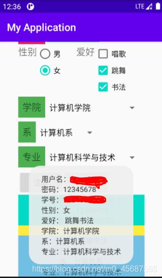 注册项:用户名、密码、学号、性别、爱好、学院、系、专业。