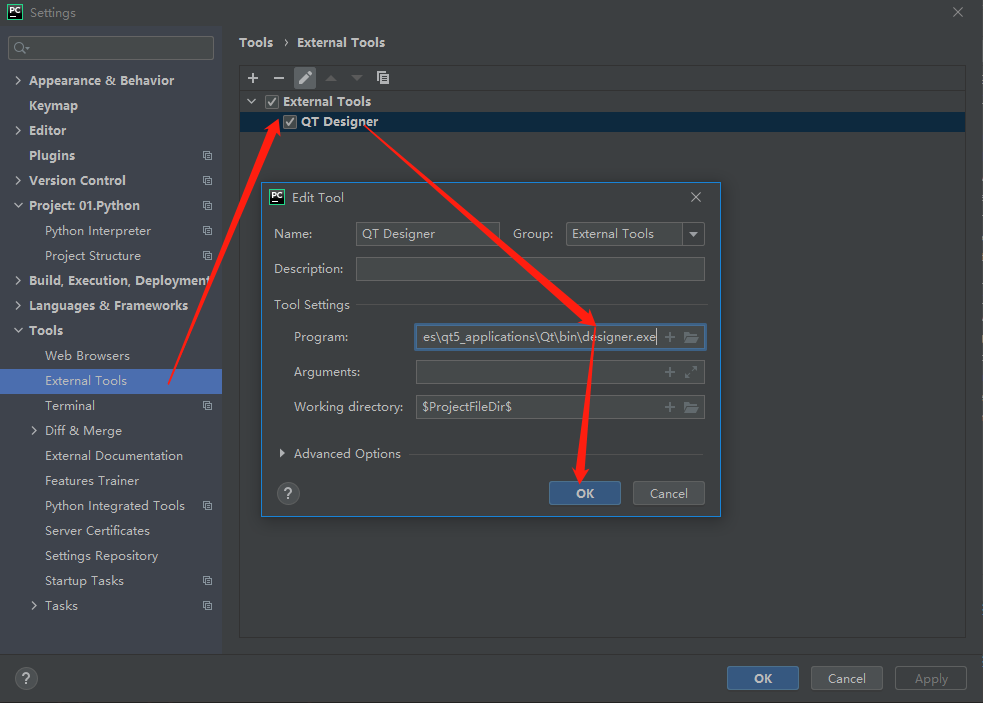 然后更新Pycharm中qt designer的启动路径如下: