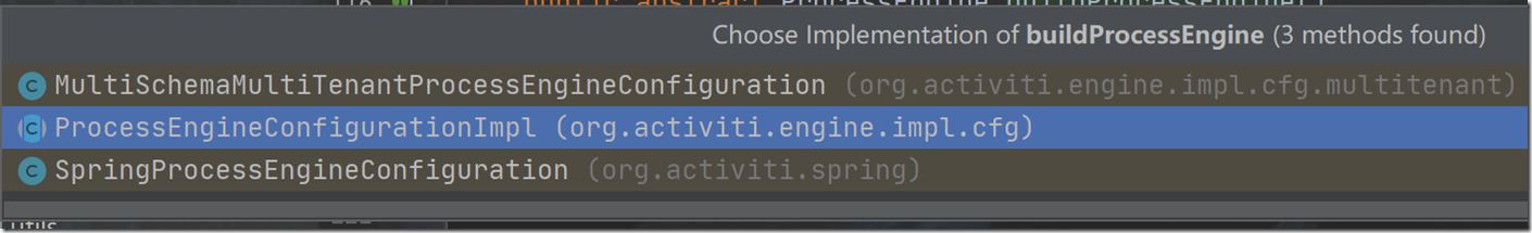buildProcessEngine()有三个子类方法的重写,默认是用ProcessEngineConfigurationImpl类继承重写buildProcessEngine初始化方法,如下图所示: