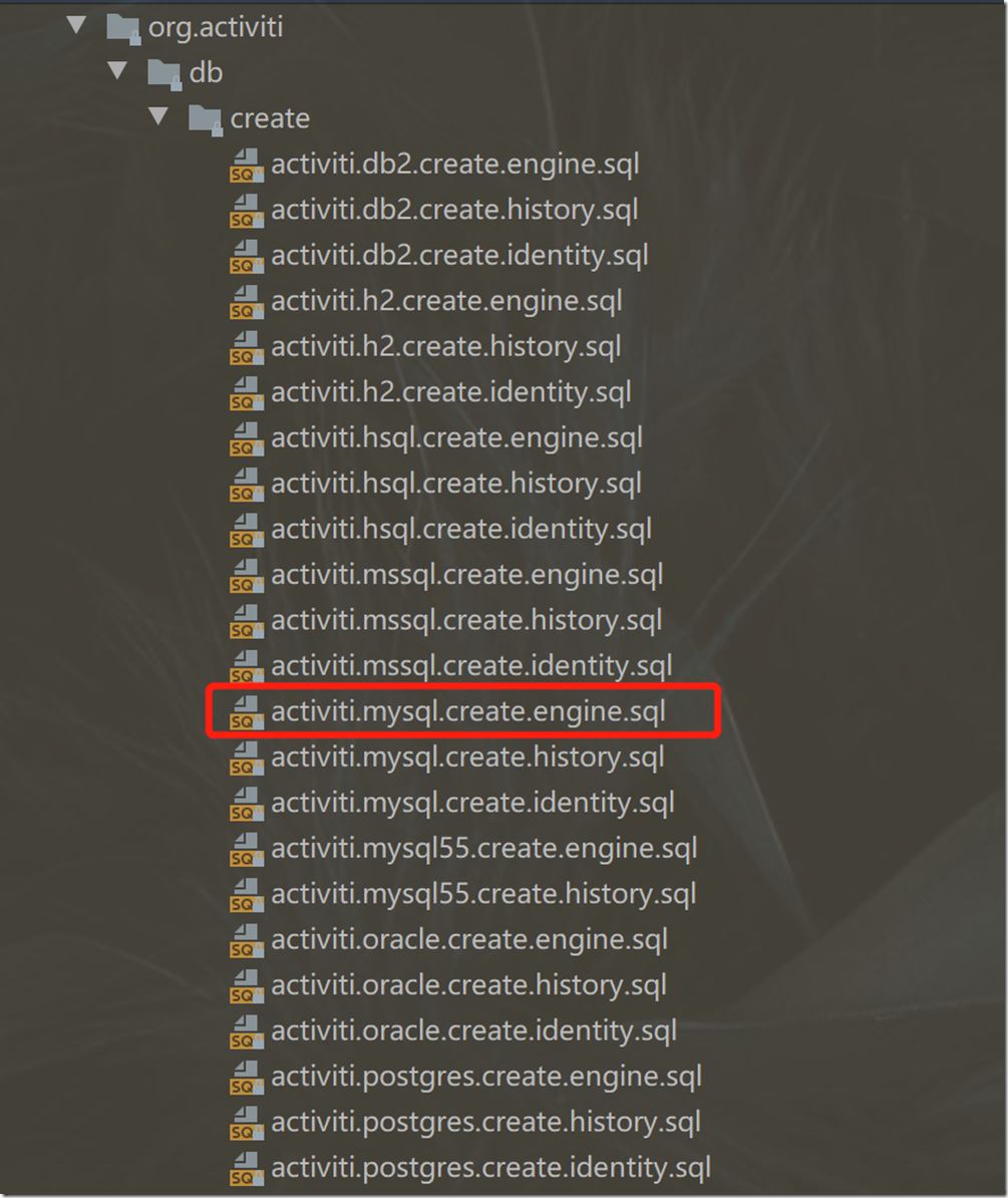 展开其中的create目录,可以进一步发现,里面根据名字区分了不同数据库类型对应的执行sql文件,其中,有db2、h2、hsql、mssql、mysql、mysql55、oracle、postgres这八种类型,反过来看,同时说明了Activiti工作流引擎支持使用这八种数据库。通常使用比较多的是mysql。根据刚刚的路径org/activiti/db/create/activiti.mysql.create.engine.sql,可以在下面截图中,找到该对应路径下的engine.sql文件——