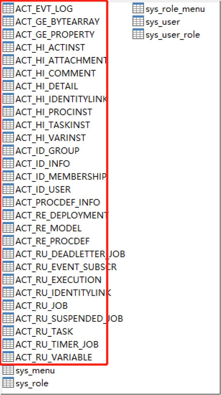最后,进入到数据库,可以看到,已成功生成28张ACT开头的工作流自带表——