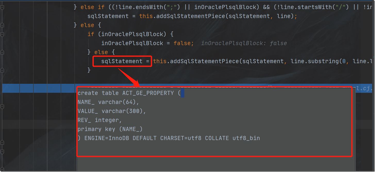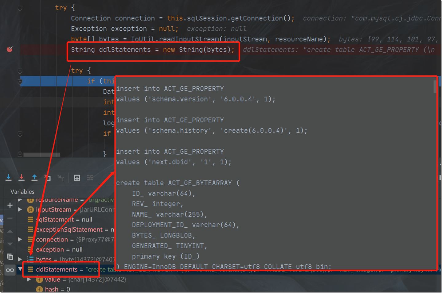 这一步主要通过输入流InputStream读取engine.sql文件的字节,然后再传入到 this.executeSchemaResource(operation, component, resourceName, inputStream)方法当中,而这个方法,将是Activiti建表过程中的核心所在。