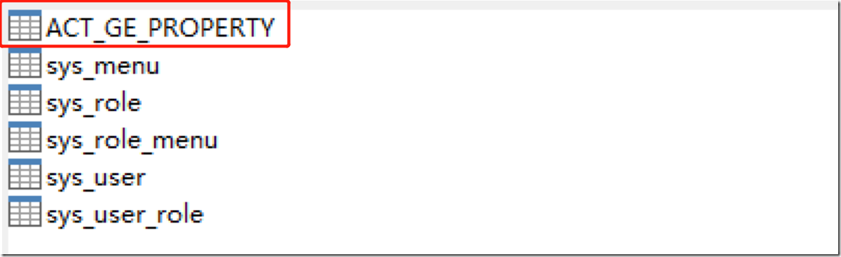 执行完一个建表语句,就会在数据库里同步生成一张数据库表,如上图执行的是ACT_GE_PROPERTY表,数据库里便生成了这张表: