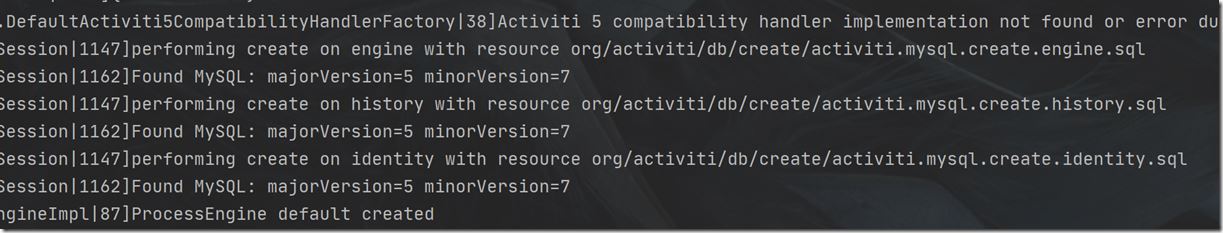 在执行完之后,看idea控制台打印信息,可以看到,我的数据库是5.7版本,引擎在启动过程中分别执行了engine.sql、history.sql、identity.sql三个sql文件来进行数据库表结构的构建。