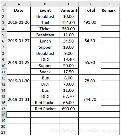想在Total列中对每日的Amount进行汇总,然后对Date和Total进行合并居中,效果如下: