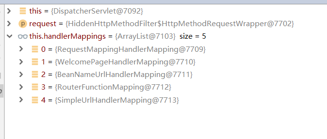 我们将断点标记在getHandler方法上时,可以清除看到handlerMappings,如图。