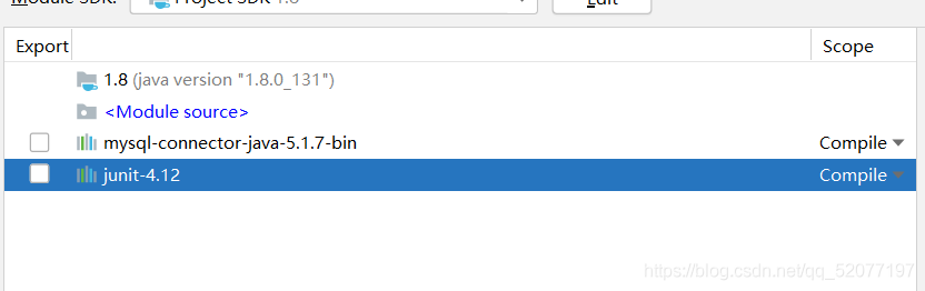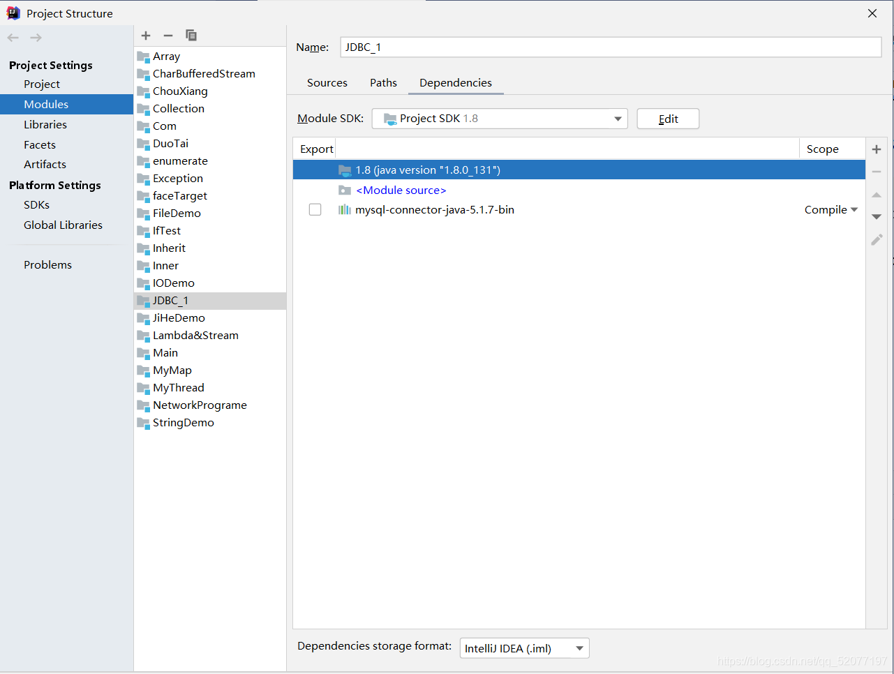 点击进来以后选择modules,再点击当前的项目JDBC,就可以看到当前模块的一些依赖库,此时是没有导入junit4的。