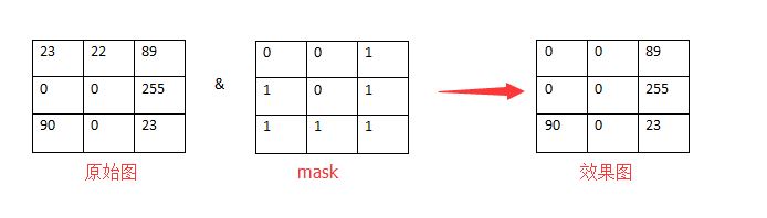 其实就是原图中的每个像素和掩膜中的每个对应像素进行与运算。比如1 & 1 = 1;1 & 0 = 0;