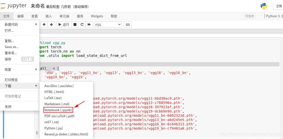 然后点击“文件”、通过“下载”将其保存为“ipynb的格式”的文件;