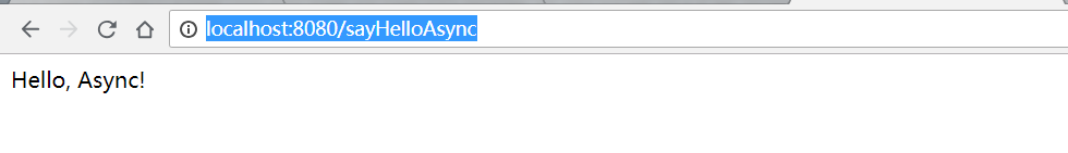 六、最后启动main方法,通过浏览器地址栏访问 http://localhost:8080/sayHelloAsync,发现秒出现如下页面,且控制台会出现如下内容,说明我们配置的默认线程池和自定义线程池都起作用了,到此,配置成功