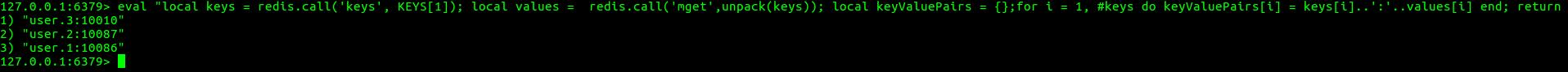 eval "local keys = redis.call('keys', KEYS[1]); local values = redis.call('mget',unpack(keys)); local keyValuePairs = {};for i = 1, #keys do keyValuePairs[i] = keys[i]..':'..values[i] end; return keyValuePairs;" 1 "user*",