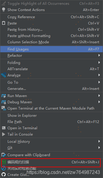 在你需要检查的代上面,点击右键,选择编码规约扫描