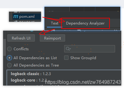 安装好后在pom文件的左下角有两个tab,打开Dependency Analyzer: