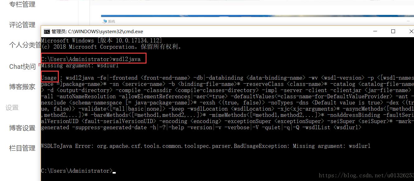 2.2,运行cmd,执行命令wsdl2java,等待大概1秒钟,出现USAGE证明设置成功