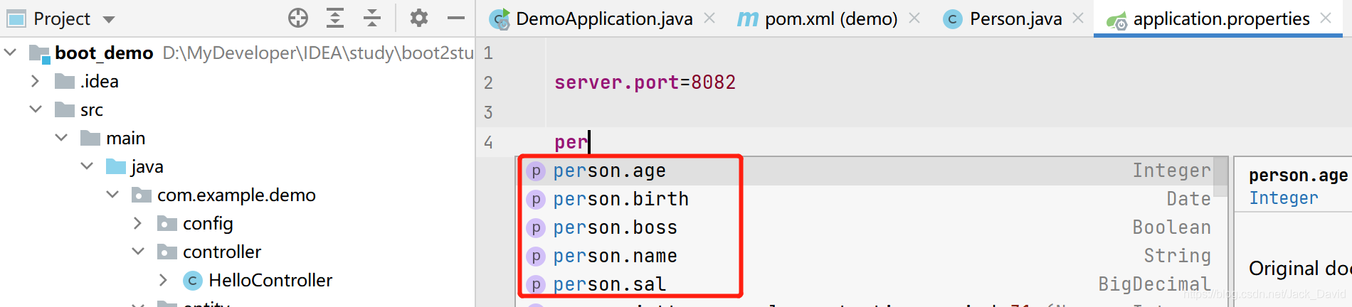 这里我们配置我们的配置文件application.properties,idea会自动提示我们相关的属性配置;