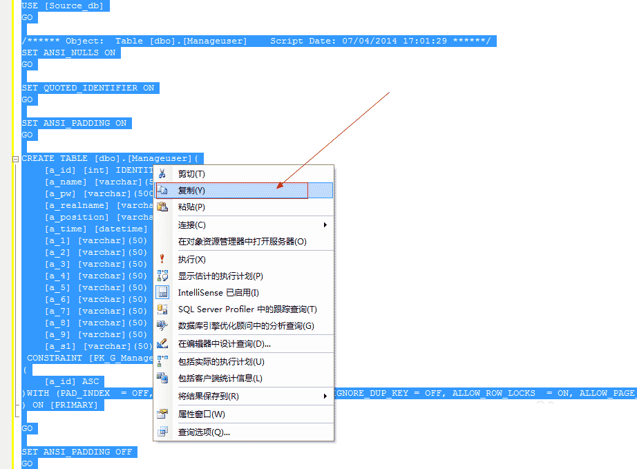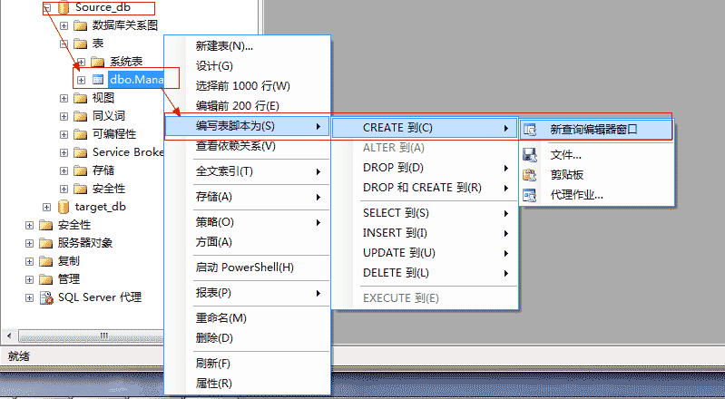 首先,打开并连接Sql Server,在源数据库Source_db(源数据库名称)上右键,然后依次点击“编写表脚本为”→“CREATE到”→“新查询编辑器窗口”。