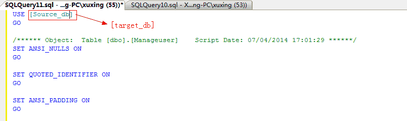 新建查询,然后右键”粘贴“(或ctrl+v);如图所示,将代码中Source_db(源数据库名)改为target_db(目标数据库名)。接着右键单击”执行“执行代码。