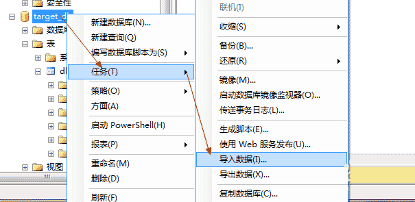 选中目标数据库target_db,然后点击”任务“→”导入数据“。