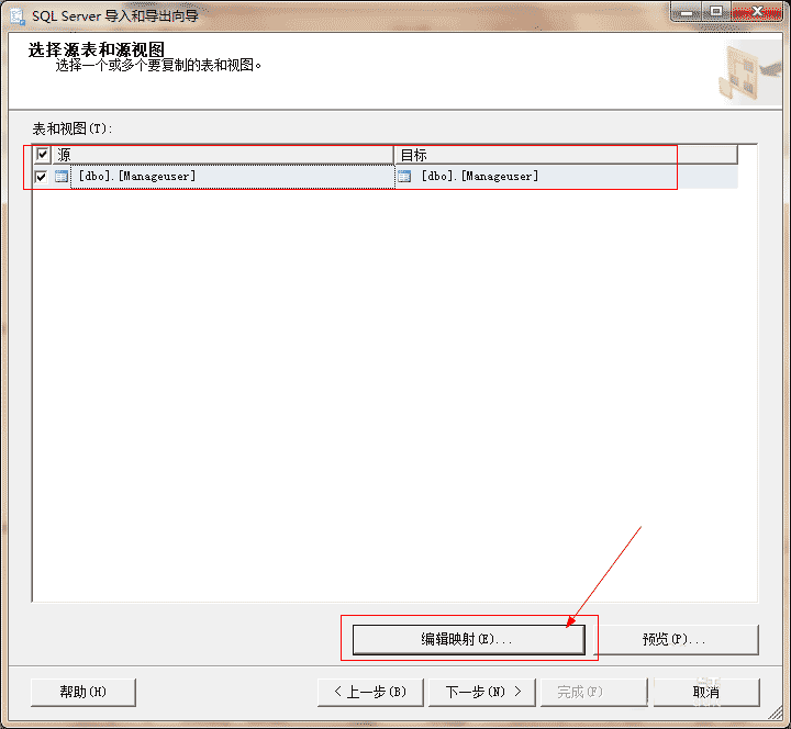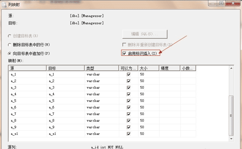 选择源表和源视图:设置源表和目标表后,单击“编辑映射”按钮,在弹出窗口中选中“启用标识插入”。(否则后面会出错)