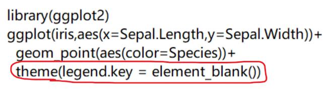 library(ggplot2) ggplot(iris,aes(x=Sepal.Length,y=Sepal.Width))+ geom_point(aes(color=Species))+ theme(legend.key = element_blank())