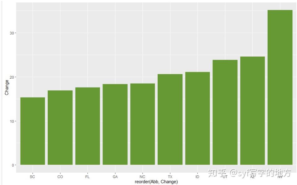 所以要想生成我们想要的顺序的柱状图:要么手动设置因子的顺序,要么按照按照一定的逻辑排列:比如,按照y轴的值从小到大排列。那么: