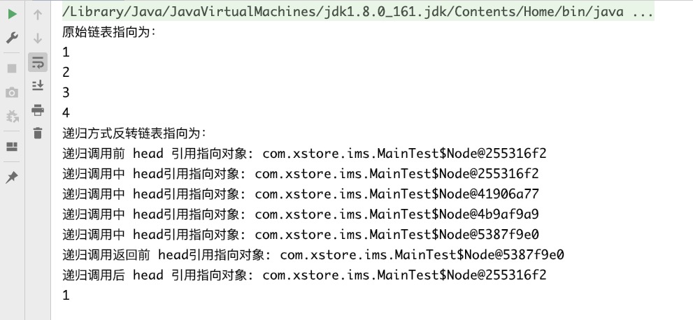 System.out.println("递归调用中 head引用指向对象: " + head.toString());