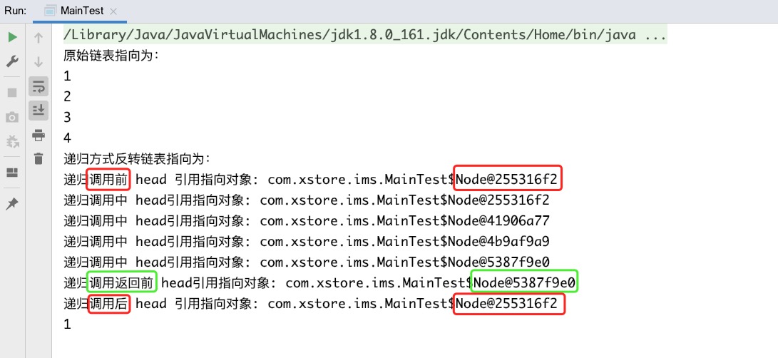 从上面👆的运行结果看,在递归函数执行期间,head引用指向的对象确实发生了变化