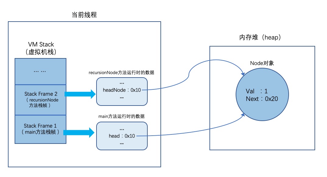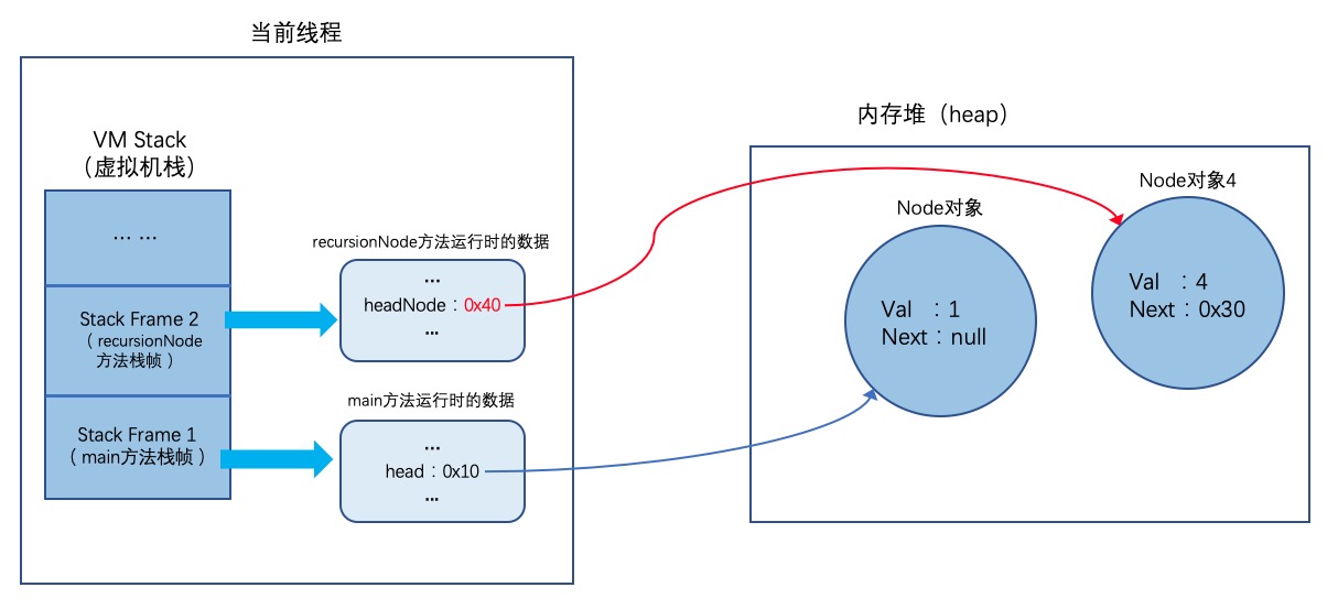 recursionNode方法中的 headNode 引用实际保存的也是一个地址,通过这个地址可以找到堆中的一个Node对象