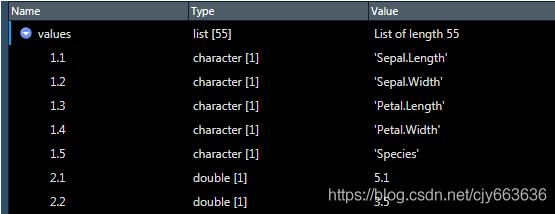 > names(values) #查看values的名称向量 [1] "1.1" "1.2" "1.3" "1.4" "1.5" "2.1" "2.2" "2.3" "2.4" "2.5" "3.1" "3.2" "3.3" "3.4" "3.5" "4.1" [17] "4.2" "4.3" "4.4" "4.5" "5.1" "5.2" "5.3" "5.4" "5.5" "6.1" "6.2" "6.3" "6.4" "6.5" "7.1" "7.2" [33] "7.3" "7.4" "7.5" "8.1" "8.2" "8.3" "8.4" "8.5" "9.1" "9.2" "9.3" "9.4" "9.5" "10.1" "10.2" "10.3" [49] "10.4" "10.5" "11.1" "11.2" "11.3" "11.4" "11.5"