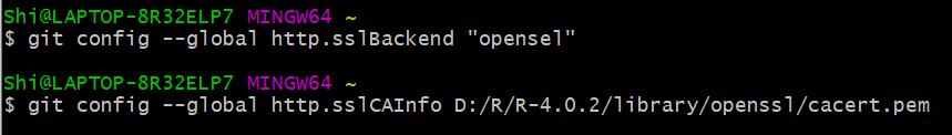 git config --global http.sslCAInfo D:/R/R-4.0.2/library/openssl/cacert.pem