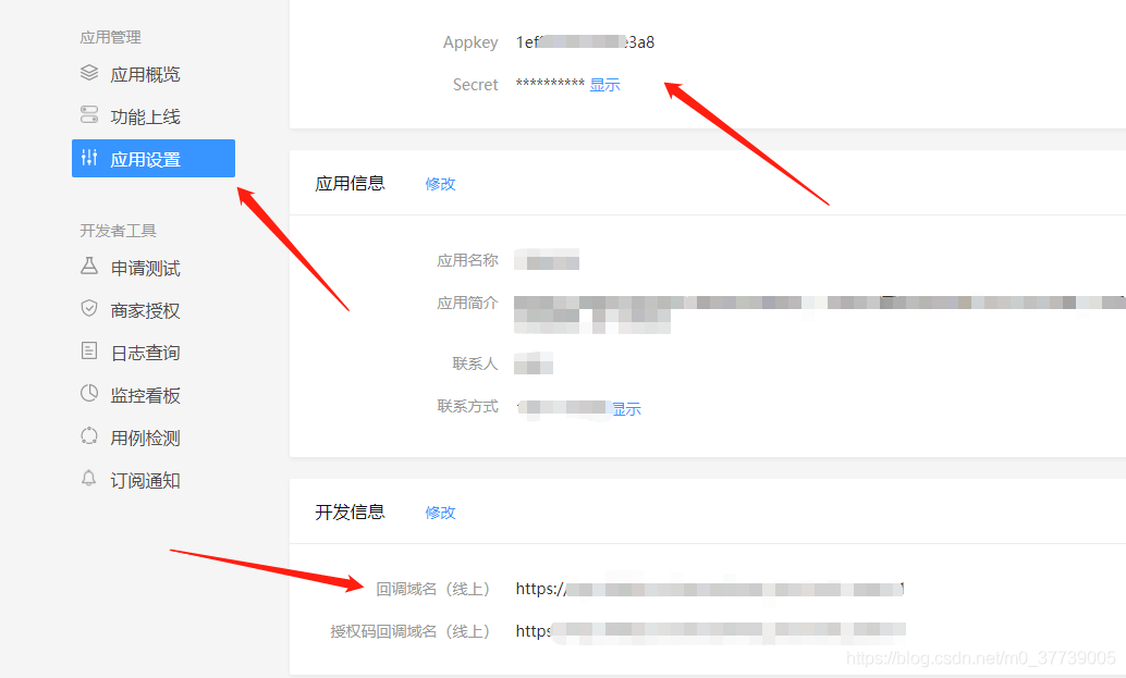 4、当放到线上的时候,选择相应的进行上线,首先要去平台“我的应用”设置回调地址,然后再授权地址上加上回调地址,还要进行授权去获取session,然后通过session去获取店铺的id