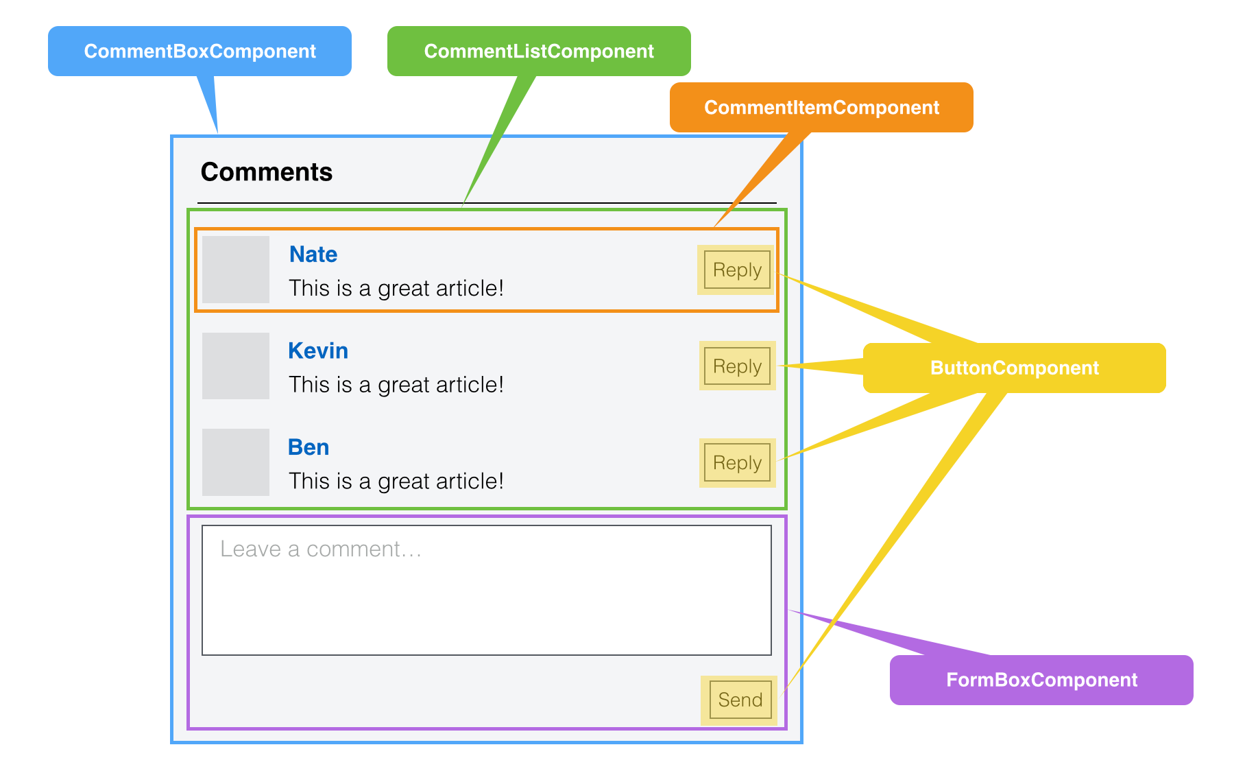 如果说MVC的思想让你做到视图-数据-控制器的分离,那么组件化的思考方式则是带来了UI功能模块之间的分离。我们通过一个典型的Blog评论界面来看MVC和组件化开发思路的区别。