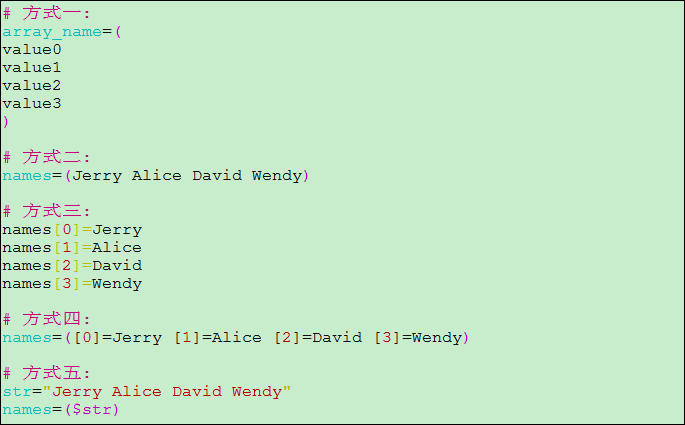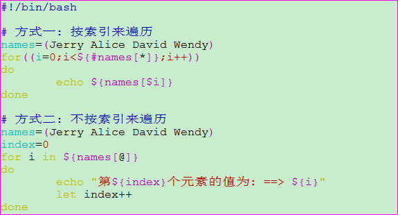 2) 定义数组其索引,可以不按顺序来定义,比如说:names=([0]=Jerry [1]=Alice [2]=David [8]=Wendy);