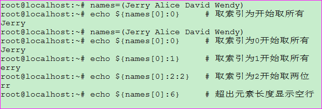 1) 通用的格式${array[@]:起始位置:长度},中间以":"隔开,如果第二项省略的话,就取后面所有的项
