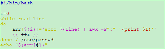 示例八: 将/etc/passwd文件中以:分隔的第一列,即用户名放置于一个数组中