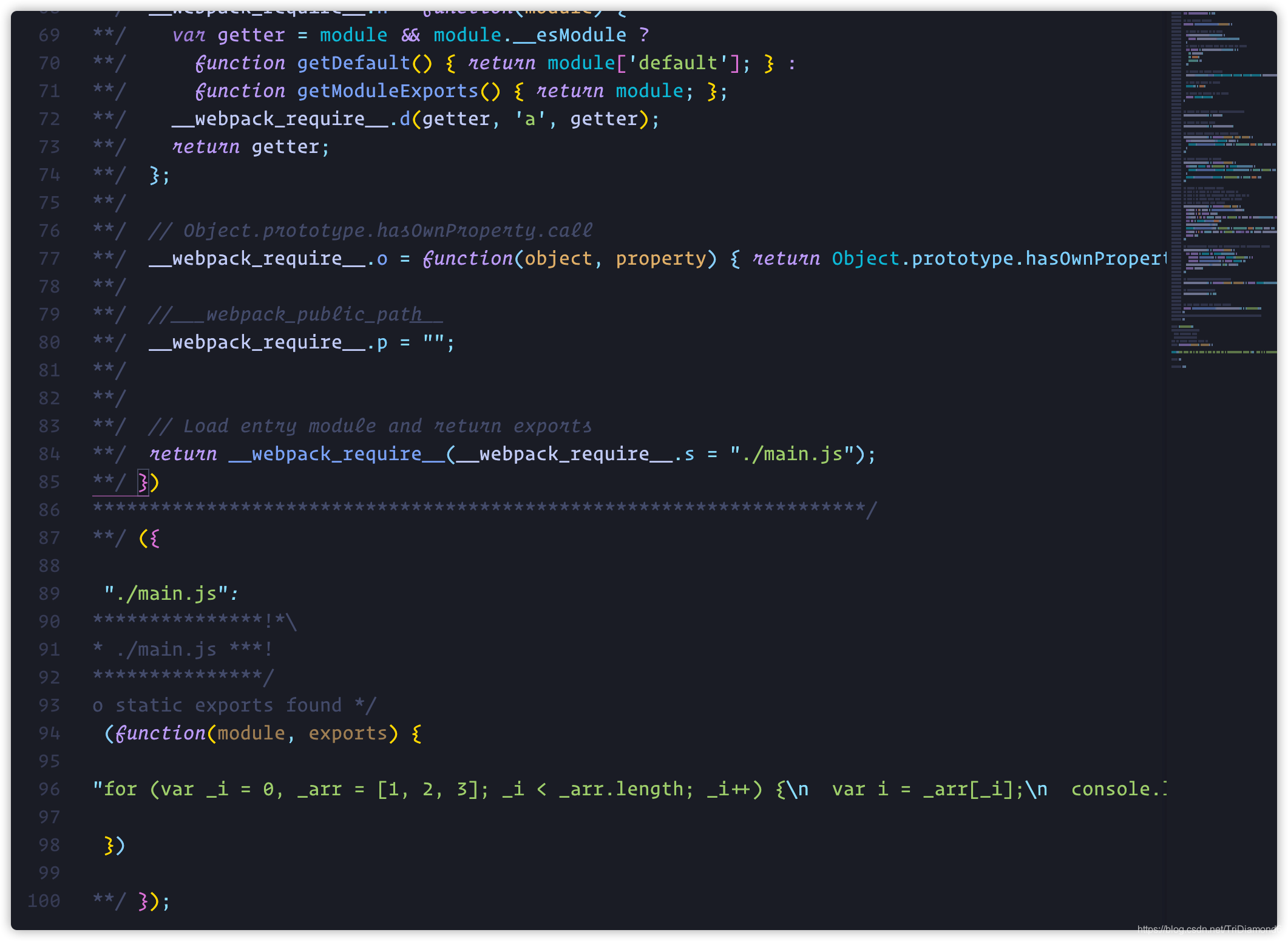 然后我们进入 dist 文件夹,打开我们编译后的 main.js,看一下我们这次使用了 babel-loader 之后的编译结果。