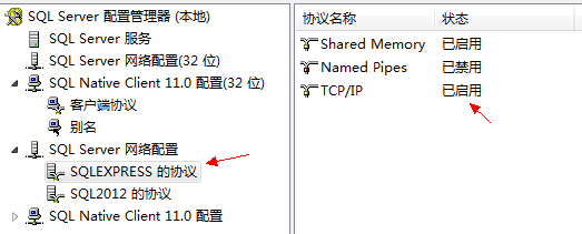 在这里我们要将SQLEXPRESS和SQL2012两个协议中的TCP/IP协议都开启。
