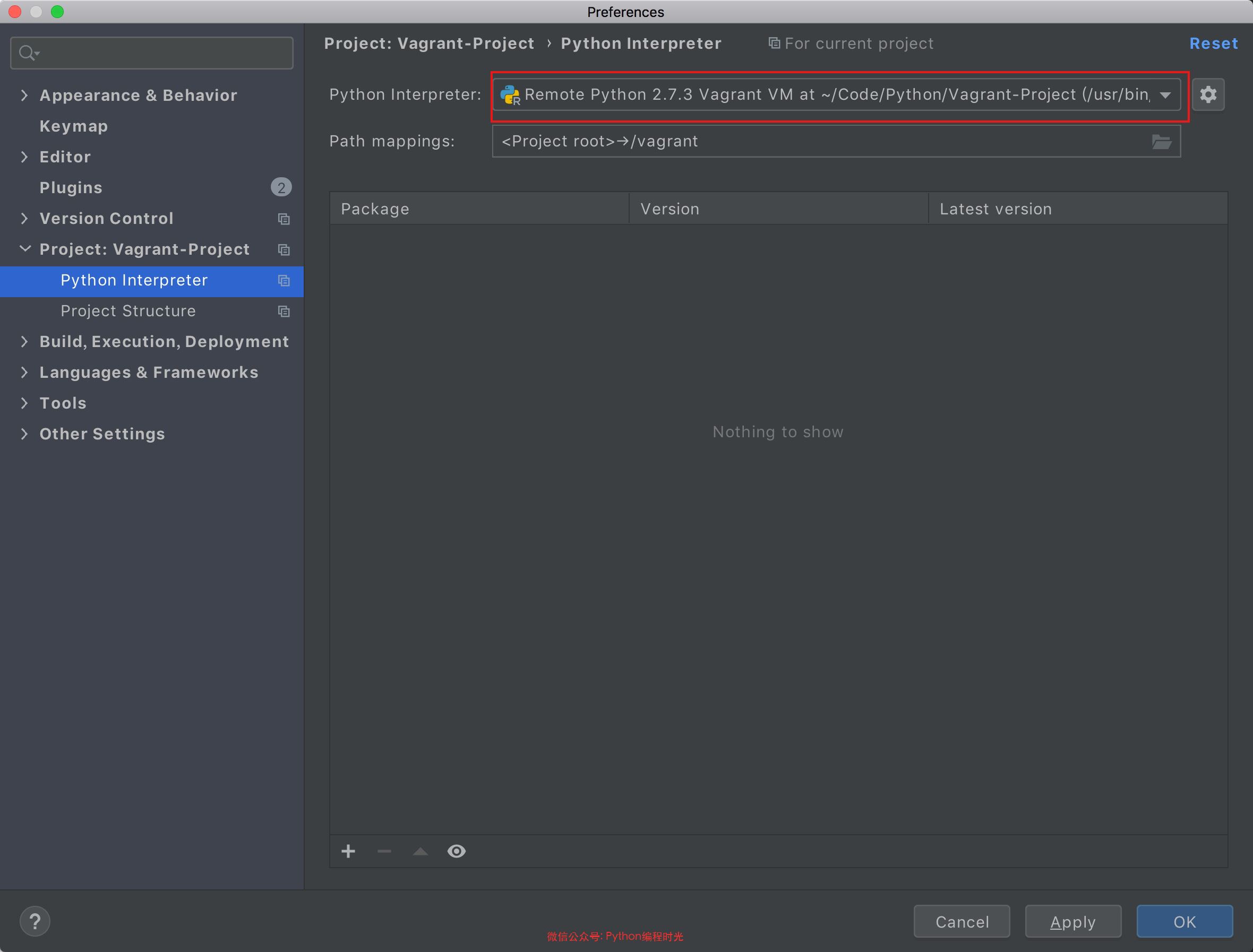 最后,再在 Project -> Python Interpreter 里添加 Vagrant 虚拟机里的 Python 解释器
