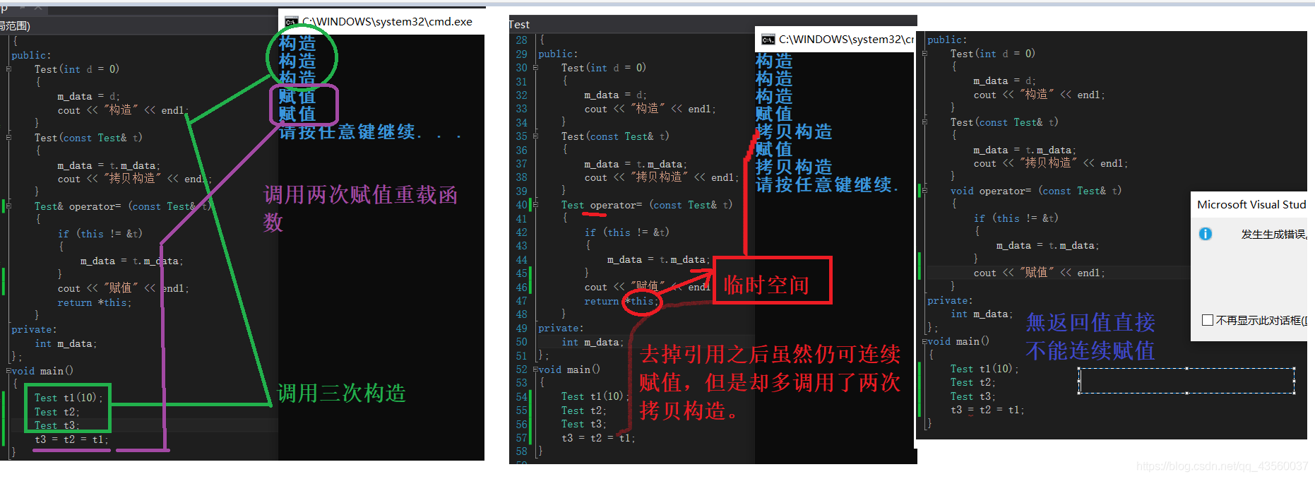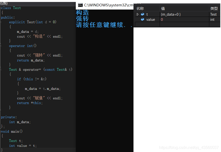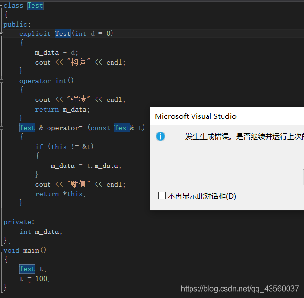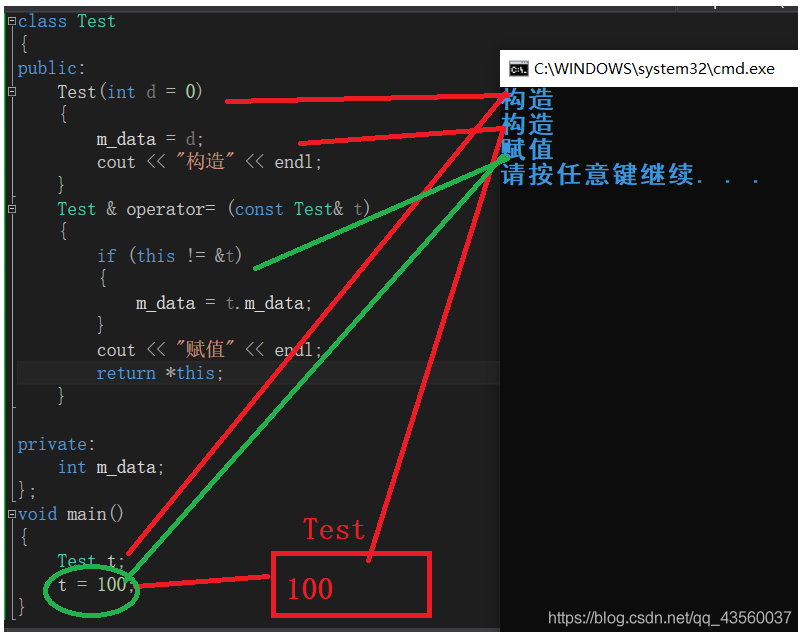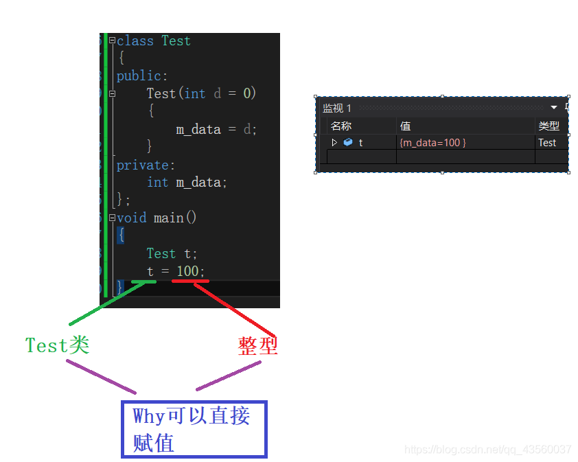 上面的代码居然可以正常运行并且赋值成功,这是为什么。实际上编译器在执行赋值语句前,将“100作为参数来构造一个无名的临时的类”然后进行赋值。