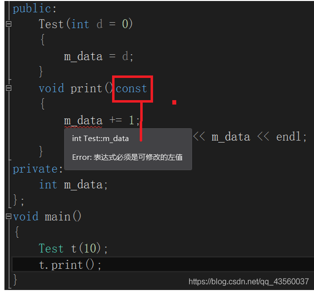 将const修饰的类成员函数称之为const成员函数,const修饰类成员函数,实际修饰该成员函数隐含的this指针,表明该成员函数中不能对类的任何成员进行修改。