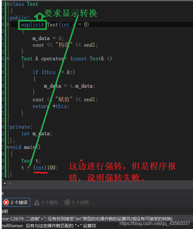 explicit关键字:如果在构造函数前加上这个关键字,则要求显示转换,不能进行隐式转换。