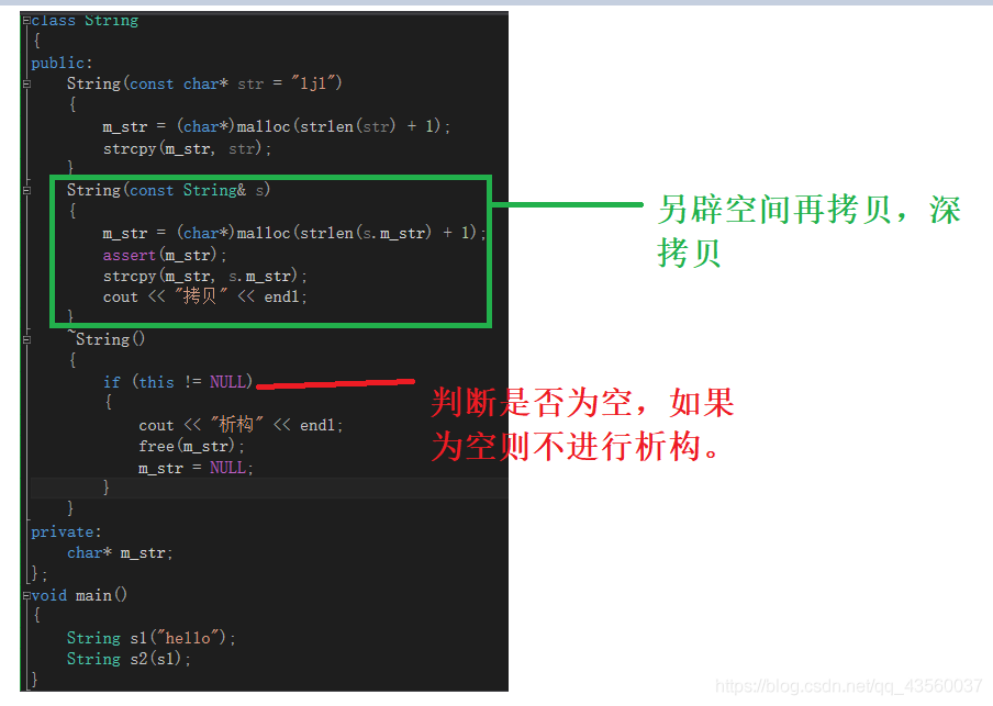 上面s1使用hello初始化,s2使用s1的值来拷贝,因此s2并未开辟新空间,而是指向s1的空间,因此在最后调用析构函数的时候,对同一块空间free了两次。