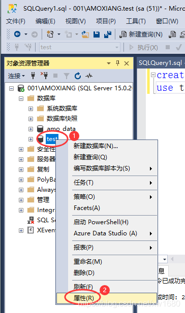 (2) 鼠标右键单击更改的数据库 test 选项,在弹出的快捷菜单中选择 属性 命令,如图所示。