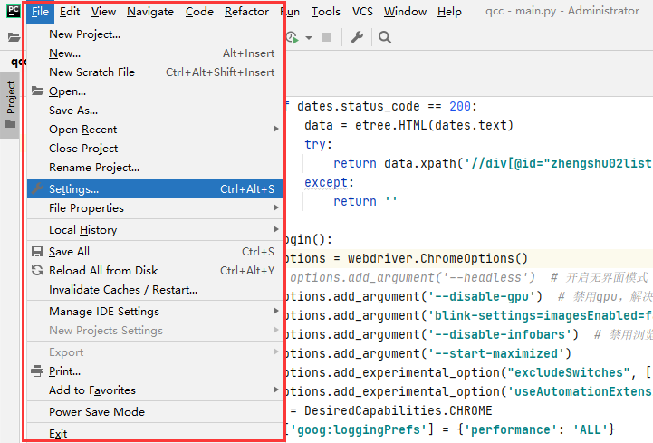 在Pycharm菜单栏中找到并点击【file】->【settings】