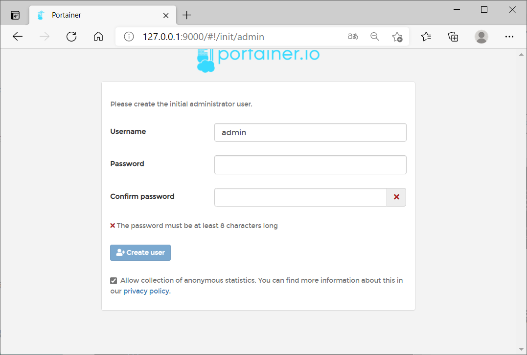 现在我需要设置管理员的账号密码,这里我简单填写密码和确认密码之后,点击Create user按钮即可创建管理员账户。