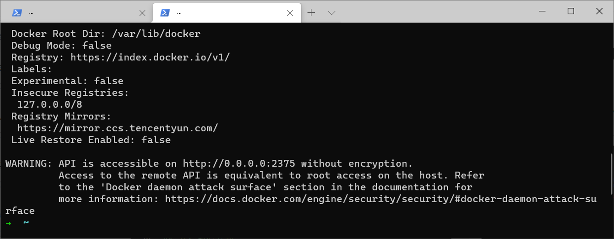 在上图中可以看到docker给了一个warning的警告提示,告知我开启远程访问会存在安全风险,这里暂时不理会它,不过出现这个提示说明确实是开启了远程访问的功能