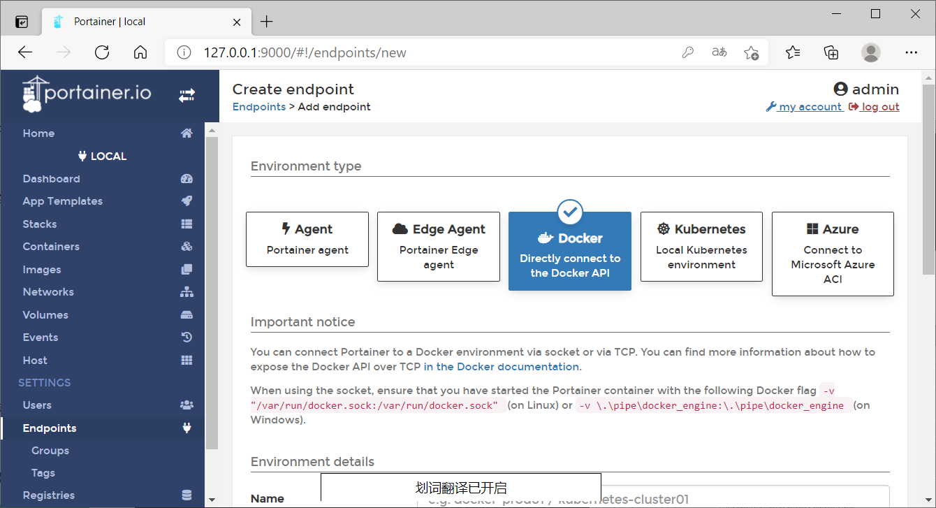 在上图中可以看到有5个选项,这里我选择最简单的一种方式,使用Docker API进行控制。