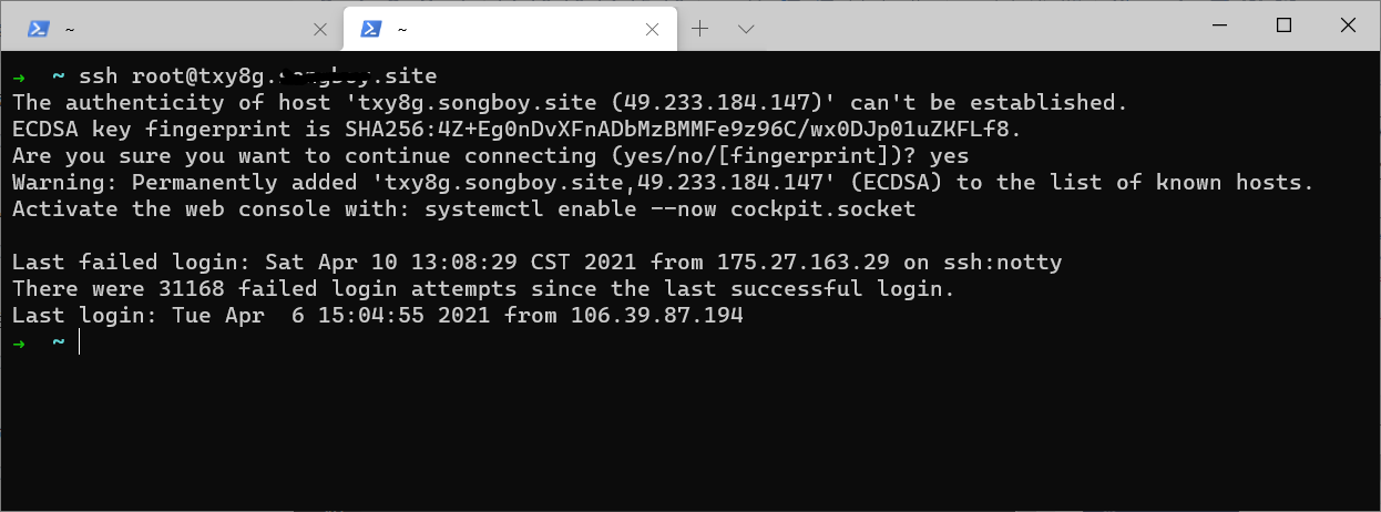 这种方法需要在节点的docker启动程序中添加参数,因此我需要先登录到节点服务器中去,ssh登登录服务器的命令如下所示