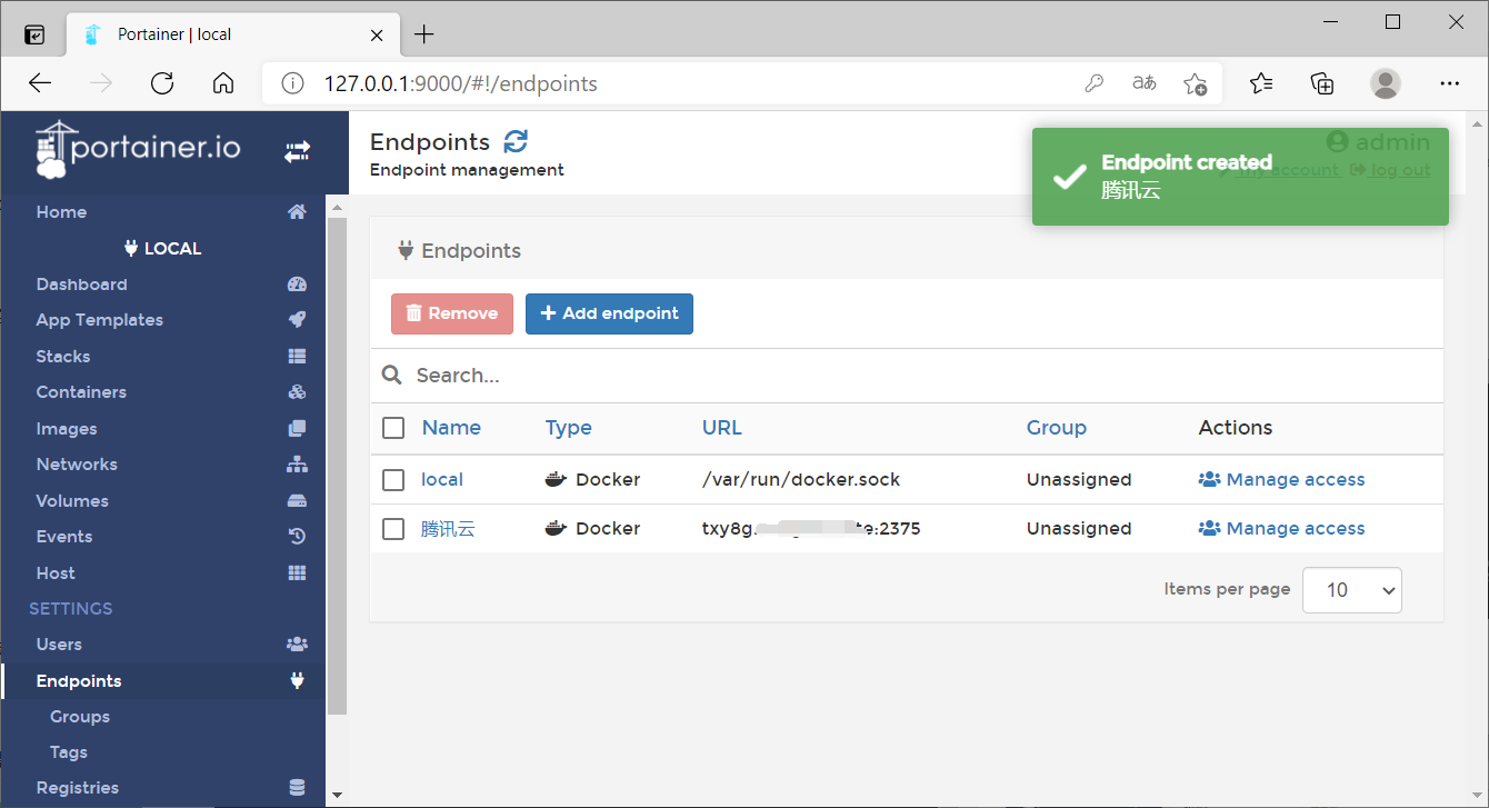 回到Portainer主页,在主页可以看到刚才添加的节点信息,如下图所示